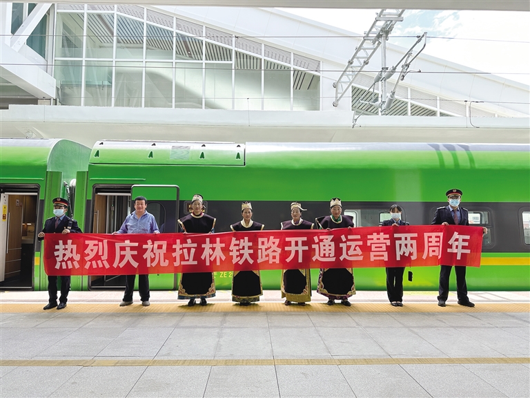 2021年6月25日,拉林鐵路開通運營,結(jié)束了藏東南不通鐵路的歷史,復(fù)興號動車開到西藏,駛上拉林鐵路,拉薩至山南、林芝最快1小時4分、3小時30分可達(dá);山南至林芝最快2小時22分可達(dá),相比汽車,從拉薩到林芝的時間幾乎節(jié)省了一半,從山南到林芝,也節(jié)省了2個多小時。兩年來,隨著運行方式逐漸成熟,鐵路方便、快捷的運輸優(yōu)勢逐步顯現(xiàn),客流持續(xù)攀升,青藏集團(tuán)有限公司及時根據(jù)客流情況在周末、節(jié)假日、寒暑假等客流高峰期增開281趟臨時旅客列車。兩年來,拉林鐵路共運送旅客182.5萬人次,運輸貨物41.91萬噸,拉近了藏東南地區(qū)9個城市的距離,也深刻改變了當(dāng)?shù)厝嗣竦墓ぷ骱蜕钣^念。