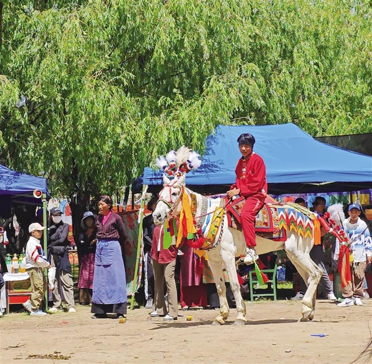 賽場(chǎng)上,幾個(gè)稚嫩的小伙子引起了大家的注意。他們熟練地跳上馬背、抓緊韁繩、目光堅(jiān)定。“哇!太棒了!”“媽媽,那個(gè)哥哥拿到了哈達(dá)!”……只見(jiàn)16歲的單增阿旺策馬奔騰,俯身拾起地上的綠色哈達(dá),獲得大家的陣陣掌聲。“我從小就很喜歡騎馬,除了去年因?yàn)閷W(xué)業(yè)緊張,沒(méi)能參加賽馬表演,往常每年都會(huì)參加?!眴卧霭⑼f(shuō)。