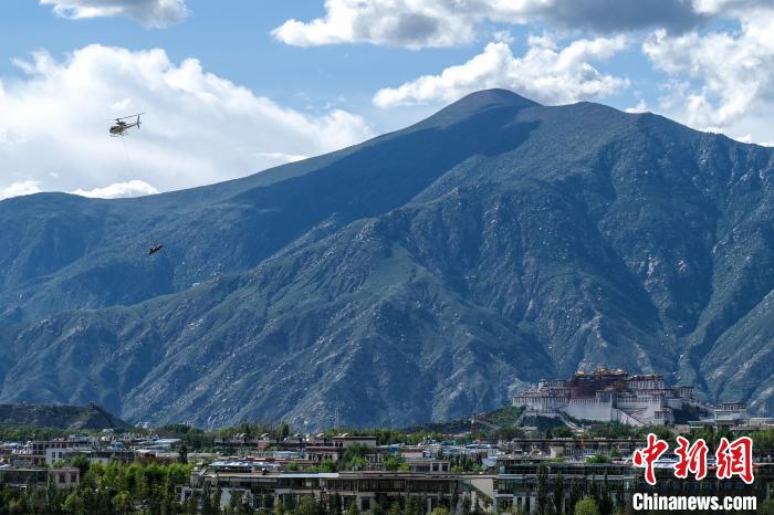 8月8日,空客H125直升機在拉薩進行吊桶灑水飛行演示。中新社記者 江飛波 攝