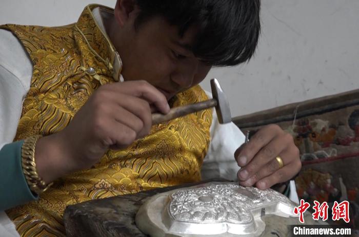 圖為扎西吉彩年輕匠人多吉次仁打制西藏婦女純銀腰飾。貢桑拉姆 攝