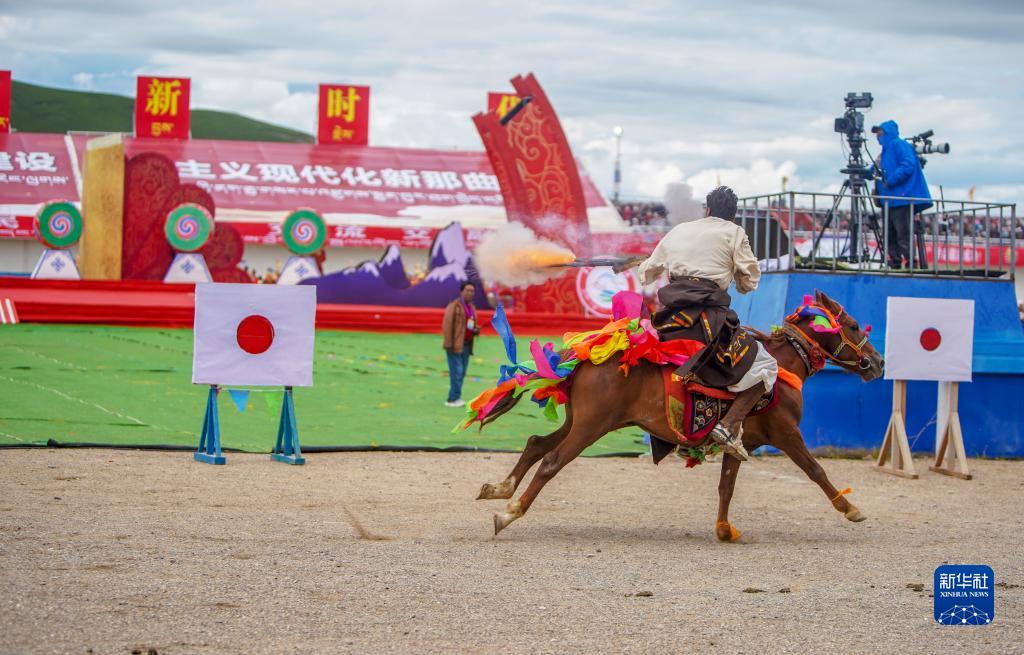 8月10日,騎手進(jìn)行馬術(shù)表演。新華社發(fā)(旦增努布攝)