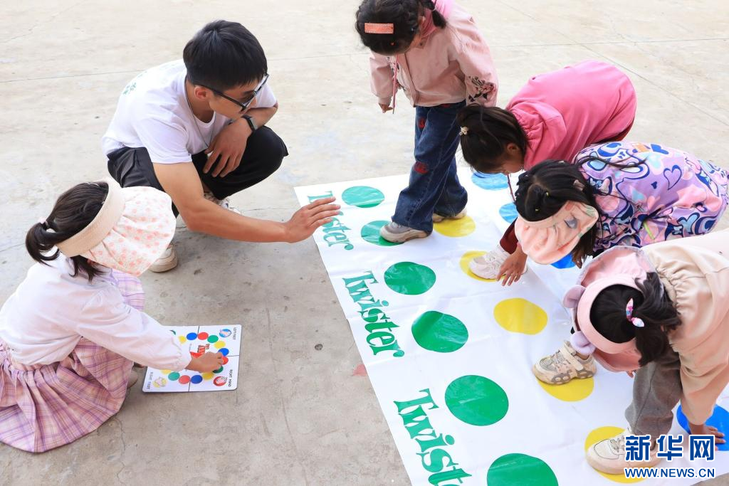 中國農(nóng)業(yè)大學(xué)峰云社人文科考隊隊員帶領(lǐng)孩子們進(jìn)行課外活動。新華社發(fā)