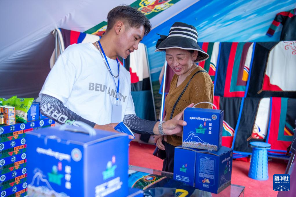 革吉縣鹽湖鄉(xiāng)羌麥村的村民旦真旺杰(左)在展銷會(huì)現(xiàn)場(chǎng)為顧客介紹產(chǎn)品(8月22日攝)。