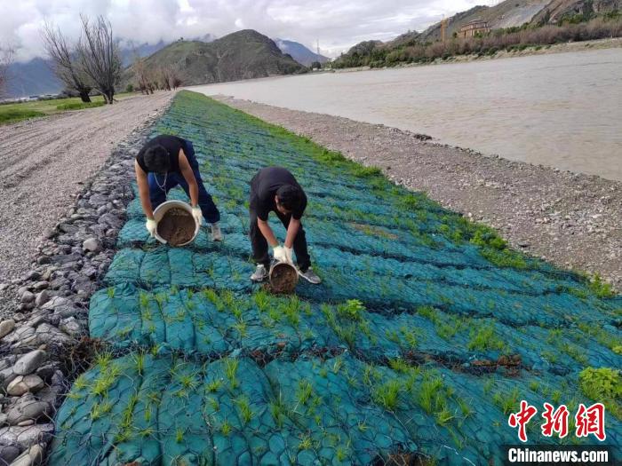 圖為工人們對生態(tài)袋進行養(yǎng)護。中國水電基礎(chǔ)局西藏分公司供圖