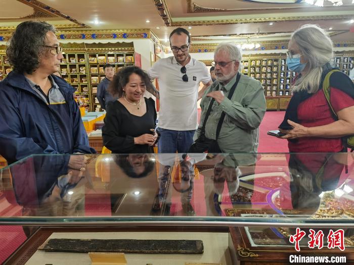 9月20日,外籍專家記者團參觀西藏大學圖書館藏文古籍研究所。中新社記者 趙延 攝