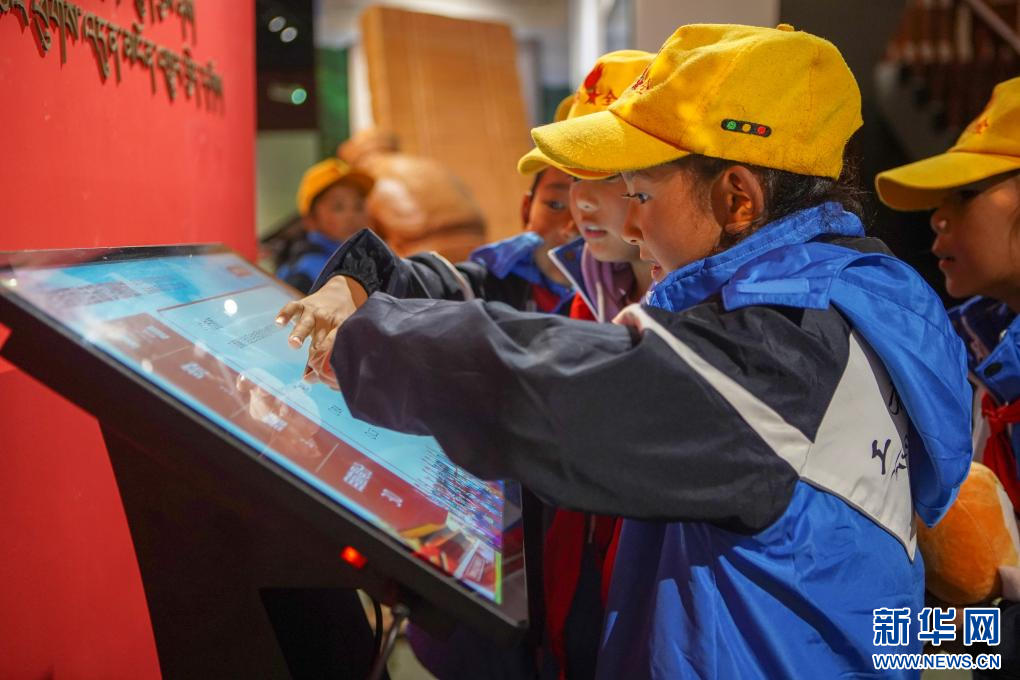 開館儀式當(dāng)天,當(dāng)?shù)匦W(xué)學(xué)生圍在館內(nèi)民族團結(jié)知識測試機器前答題。(9月27日攝)新華社記者 黃智琪 攝