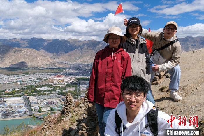 圖為9月28日,4位登山者在登上拉薩南山山頂后與遠(yuǎn)處的布達(dá)拉宮合影留念。中新社記者 江飛波 攝