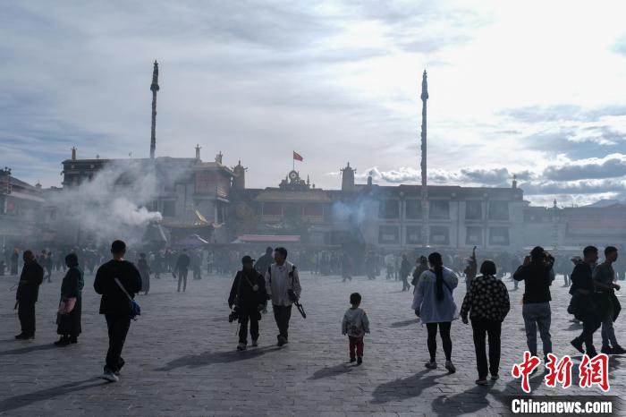 圖為9月30日上午,游客、市民在大昭寺廣場。當日恰逢轉經(jīng)日,大昭寺、八廓街桑煙氤氳,熱鬧非常。江飛波 攝