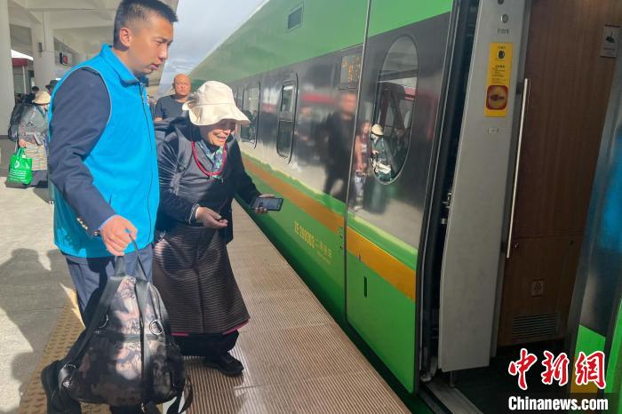 圖為西藏日喀則站工作人員攙扶老人乘車高原復興號。日喀則站 供圖