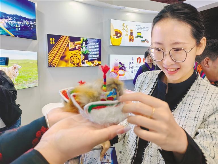 “這次畜產品展銷活動上,我們主要銷售天線帽工藝品、玉石、羊毛圍巾、羊毛毯等,產品價格比較實惠,前來咨詢購買的人也很多。展銷不到兩個小時,就賣了1000多元?!卑捕嗫h措那湖文化傳播有限責任公司負責人貢布多吉的臉上充滿了喜悅。