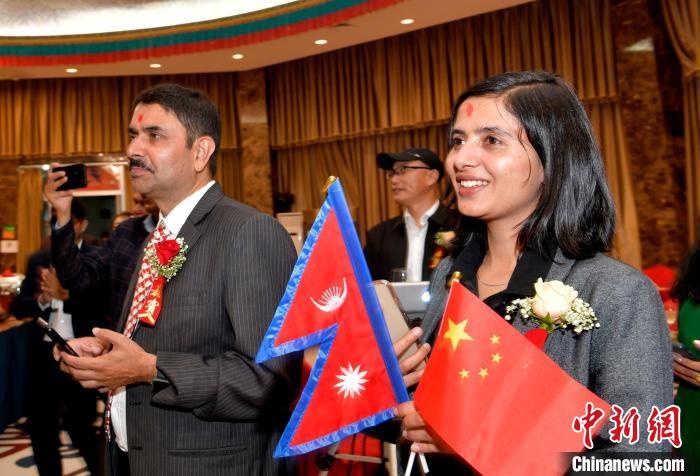 圖為10月7日,尼方人員手舉兩國(guó)國(guó)旗,載歌載舞。李林 攝