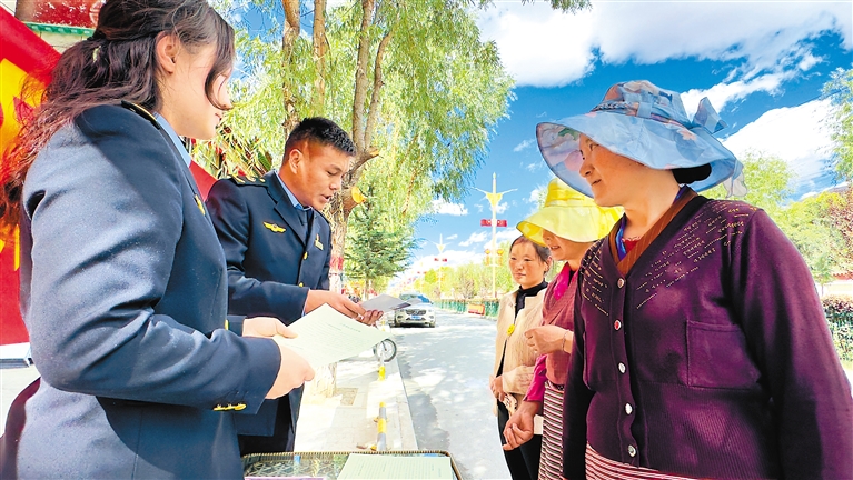圖為山南市瓊結(jié)縣市場監(jiān)督管理局執(zhí)法人員向群眾發(fā)放知識產(chǎn)權(quán)相關(guān)宣傳冊。記者 白瑪澤旺 通訊員 倫珠澤仁 攝