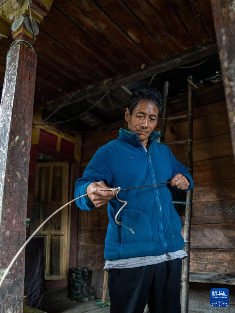 在西藏墨脫縣背崩鄉(xiāng)巴登村,一名村民在整理藤竹條(10月11日攝)。新華社記者 孫非 攝