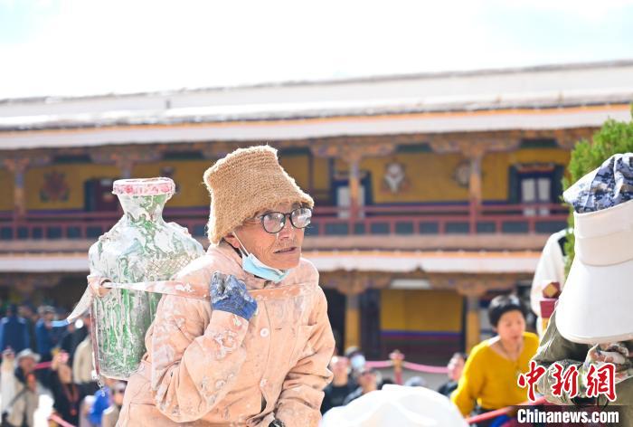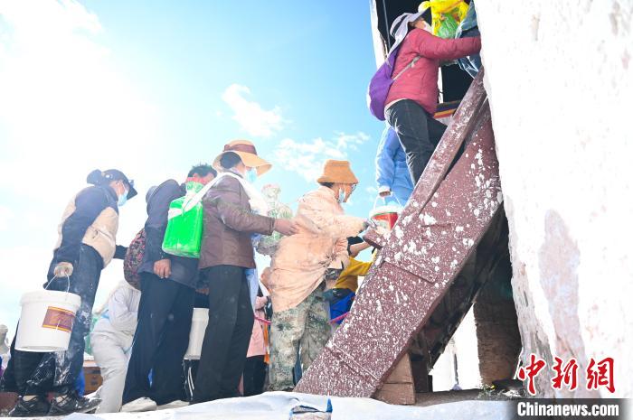 參與到粉刷中的民眾有序運(yùn)送或潑灑涂料。快70歲的丹巴渾身沾滿了白色涂料,小憩間盤腿席地而坐,正在喝甜茶的他,還不忘熱情招呼記者品嘗。這位老人原是布達(dá)拉宮的木匠,工作了28年。退休后,每年布達(dá)拉宮粉刷,他幾乎都要來參加,覺得來布達(dá)拉宮像回家一樣親切。他說:“以前都是口頭通知喊大家過來,現(xiàn)在網(wǎng)上一發(fā)消息,大家都主動(dòng)參加。”