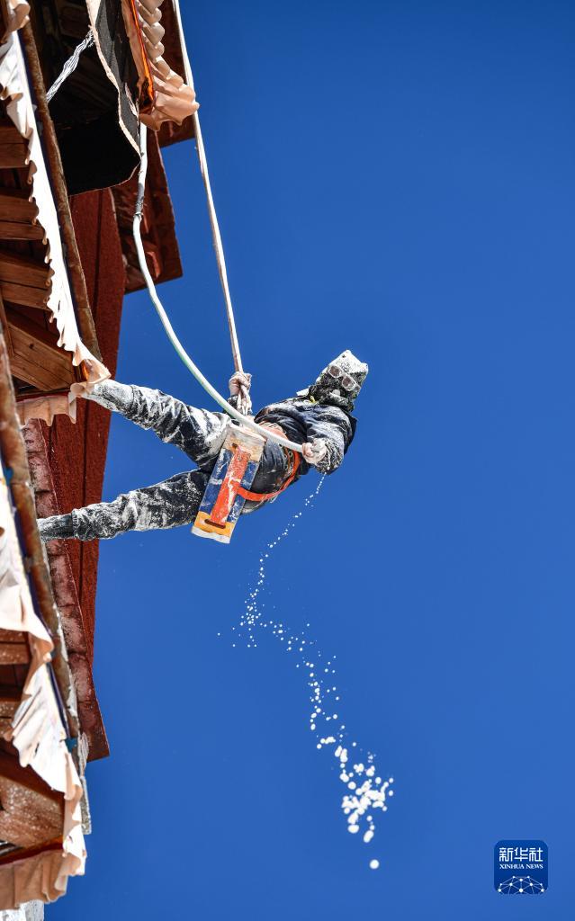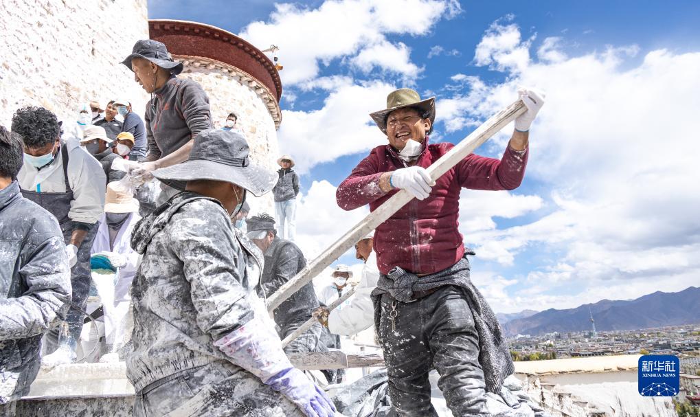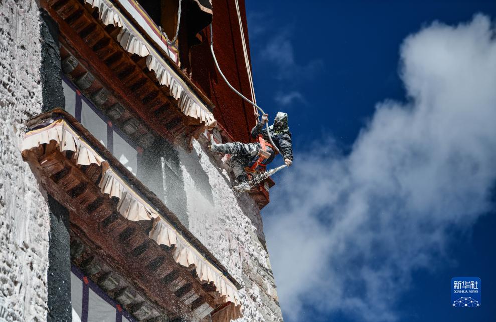 工作人員對布達拉宮外墻噴灑涂料(10月18日攝)。新華社記者 晉美多吉 攝