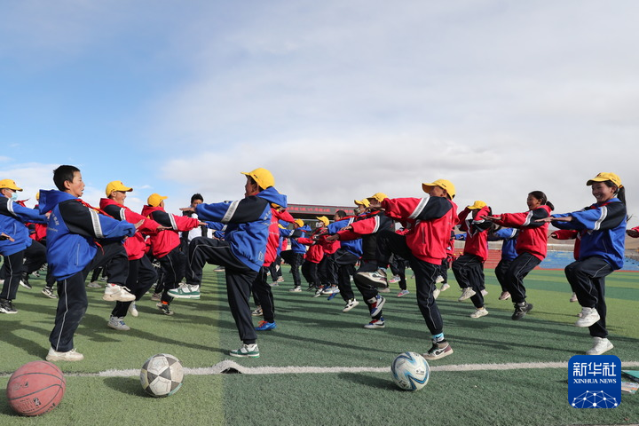 10月13日,在西藏那曲市班戈縣中石化小學(xué),學(xué)生在操場上做運動。新華社發(fā)(王敬 攝)
