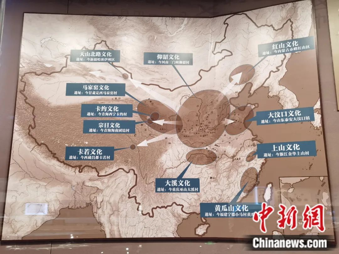國家民委主辦的“鑄牢中華民族共同體意識文物古籍展”正在民族文化宮展出。圖為展覽中展出的新石器時代的馬家窯文化、齊家文化、辛店文化、寺洼文化、卡約文化、紅山文化的位置示意圖。民族文化宮供圖