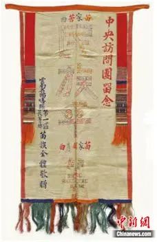 國家民委主辦的“鑄牢中華民族共同體意識文物古籍展”正在民族文化宮展出。圖為展覽中展出的新中國成立后云南省西疇縣第一區(qū)長箐鄉(xiāng)苗族全體敬獻中央訪問團的錦旗。民族文化宮供圖