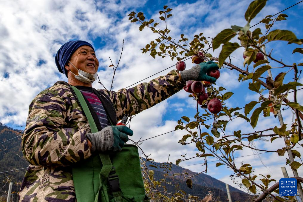 米林市羌納鄉(xiāng)西藏林芝現(xiàn)代蘋果標(biāo)準(zhǔn)化園區(qū)內(nèi),農(nóng)民在采摘蘋果(11月13日攝)。新華社記者 姜帆 攝