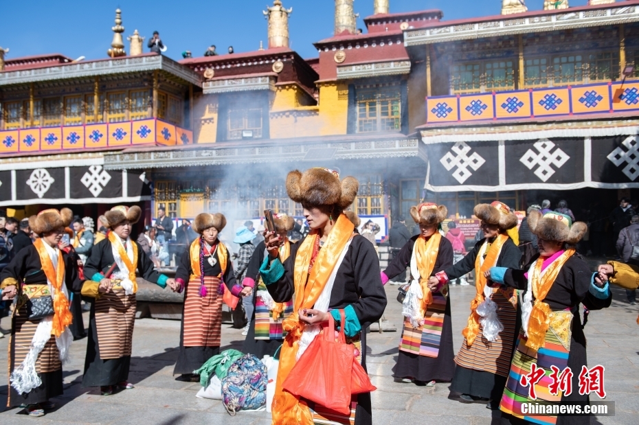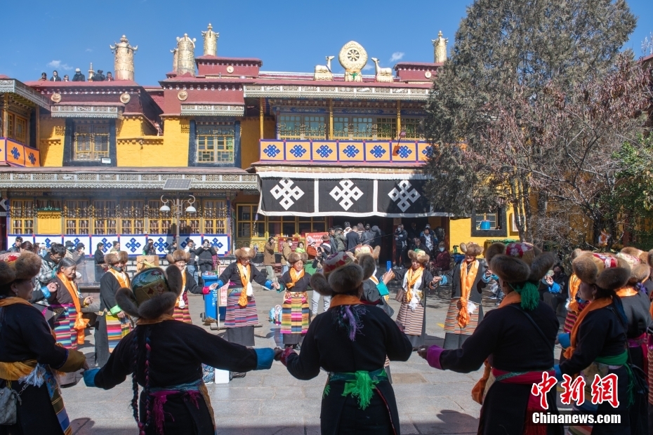 11月15日,西藏拉薩,拉薩婦女在扎基寺跳起傳統(tǒng)舞蹈,迎“仙女節(jié)”?!跋膳?jié)”即吉祥天母節(jié),藏語(yǔ)稱“白來日追”。相傳藏傳佛教最高護(hù)法神之一班丹拉姆的女兒白拉姆,不顧母親的反對(duì)與赤尊贊私定終身,班丹拉姆一怒之下將赤尊贊趕到拉薩河南岸,規(guī)定二人僅每年的藏歷十月十五日相見。中新社記者 貢嘎來松 攝