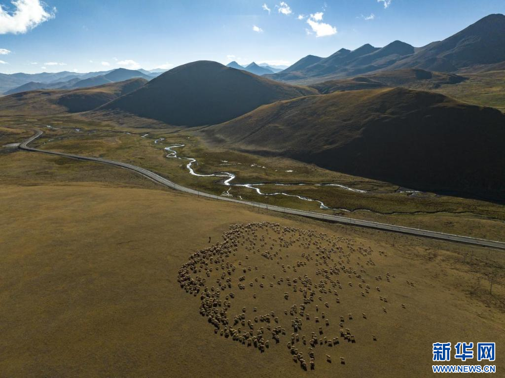 扎西松多村集體養(yǎng)殖的千只綿羊(無人機照片)。新華網(wǎng) 旦增努布 攝