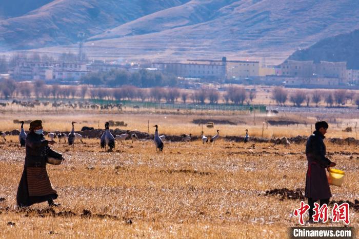 圖為拉薩林周縣境內(nèi)的村民給黑頸鶴投食。扎頓 攝