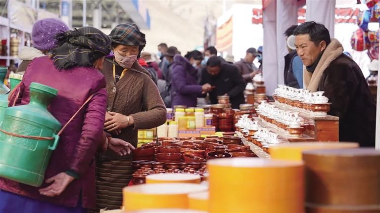 在物交會現(xiàn)場,民族手工藝產(chǎn)品、生活日用品、家具等各種商品琳瑯滿目。次仁金果藏帽、慈成藏香等種類繁多,生活日用品一應俱全,尼泊爾商品更是吸引了眾多市民駐足圍觀。