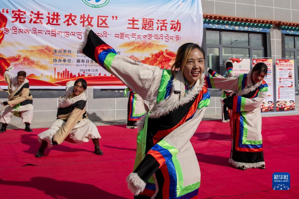 12月6日,森布日生態(tài)搬遷安置點的群眾在“憲法進農(nóng)牧區(qū)”主題活動上表演歌舞。新華社記者 姜帆 攝