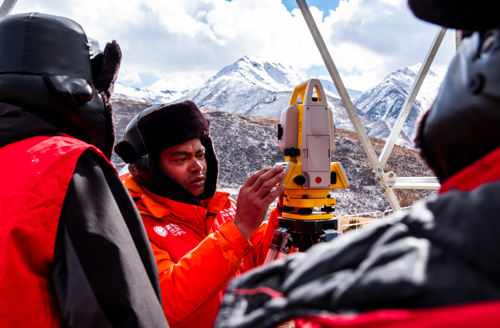 索縣榮布至丁青縣巴達(dá)35千伏線路工程負(fù)責(zé)人黃小洪在現(xiàn)場(chǎng)開展線路弧測(cè)量教學(xué)。(趙清鵬 攝)