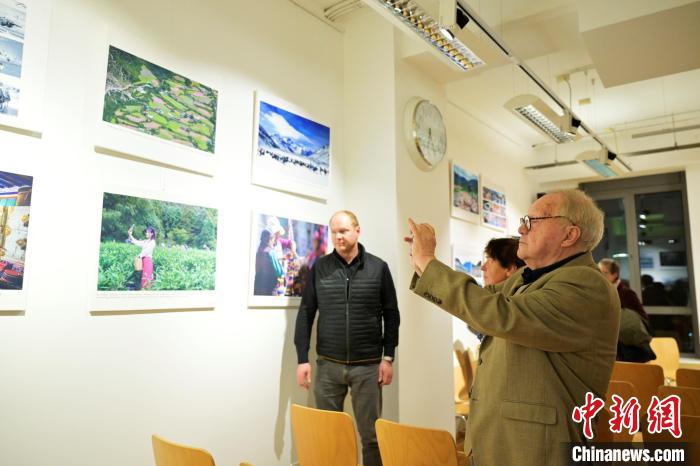 維也納商會市場部主席馬庫斯·漢茨(Markus Hanzl)參觀“和美西藏”攝影展。歐洲時(shí)報(bào)記者 周修怡 攝