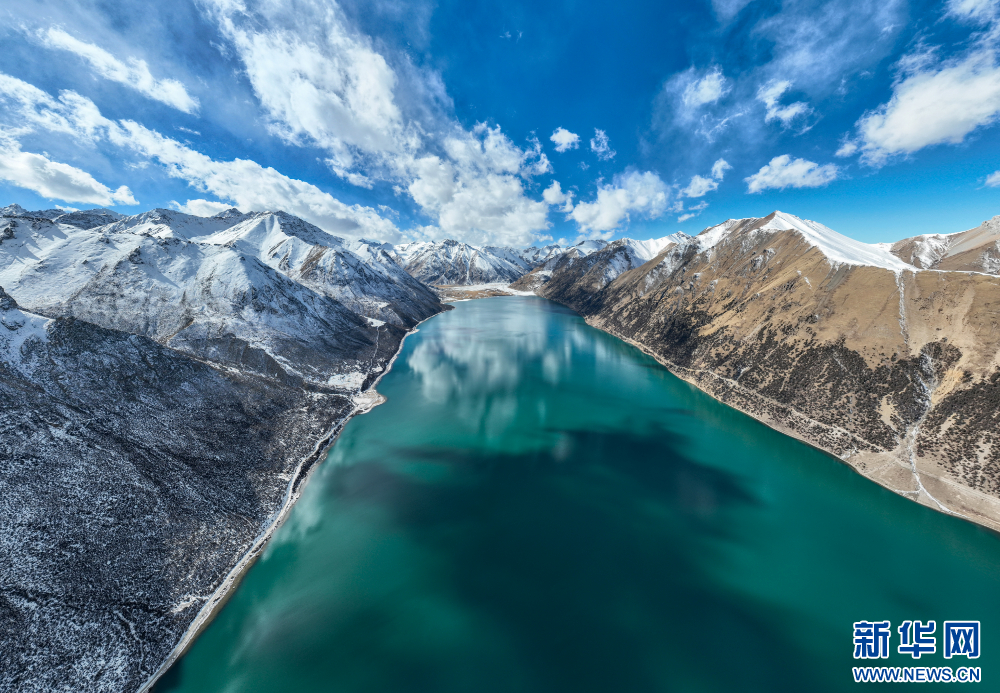 12月10日,從嘉乃玉錯(cuò)湖邊拍攝的雪山(無(wú)人機(jī)照片)。新華網(wǎng) 旦增努布 攝
