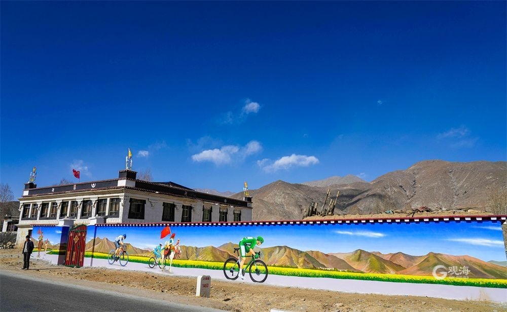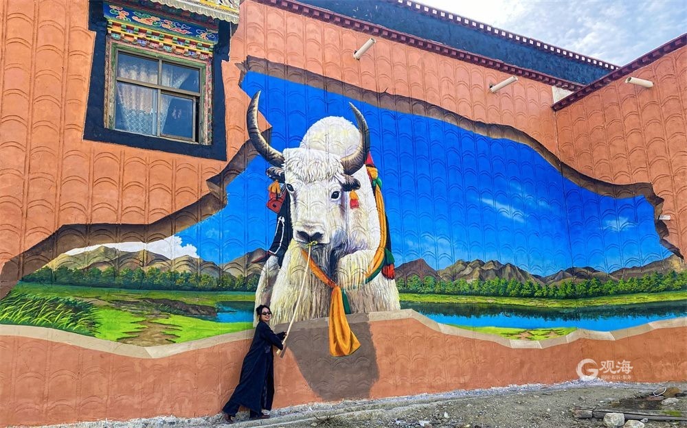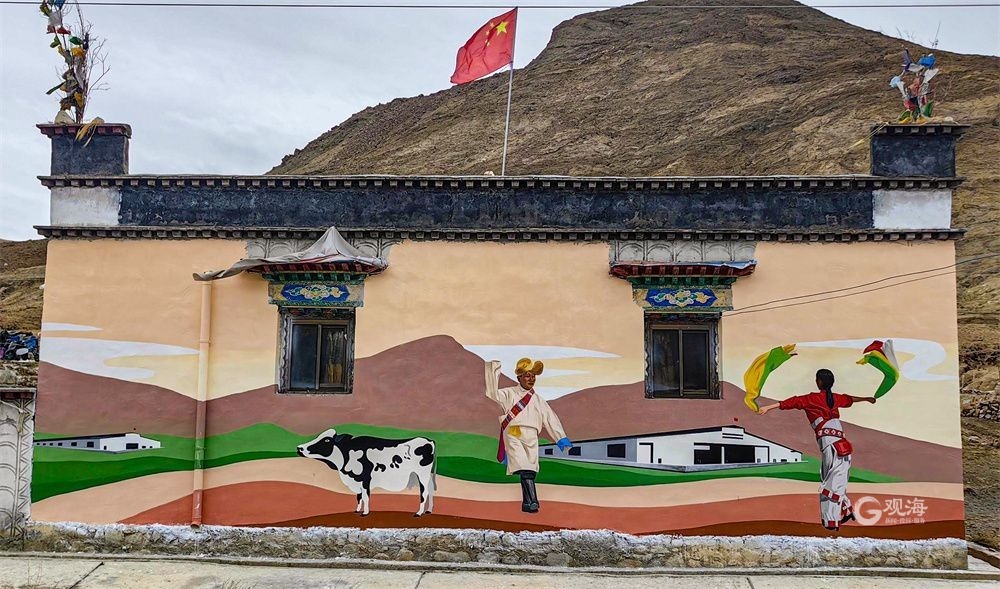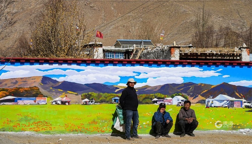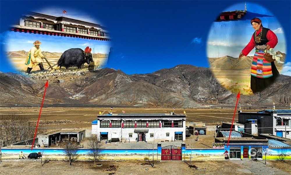 廣袤的高原上,在連綿起伏的山巒之下,是藏族農(nóng)家趕著傳統(tǒng)的“二牛抬杠”耕耘的場(chǎng)景,旁邊的“阿佳”則撒下希望的青稞種子……這樣的場(chǎng)景當(dāng)然不會(huì)出現(xiàn)在現(xiàn)在這個(gè)滴水成冰的季節(jié),而是躍然于藏家傳統(tǒng)村居的院墻之上?!拔壹疫@面墻原來就是貼滿了牛糞,現(xiàn)在畫上了我們平時(shí)勞動(dòng)的景象,感覺比之前更好看了?!鄙V樽螀^(qū)東嘎鄉(xiāng)色定村的村民旦瓊說,此前的一年又一年,他都是把牛糞貼在墻上,固然有傳統(tǒng)的高原美感,但是與現(xiàn)在院墻上畫的鄉(xiāng)村振興的場(chǎng)景相比,還是現(xiàn)在的感覺更不錯(cuò)。