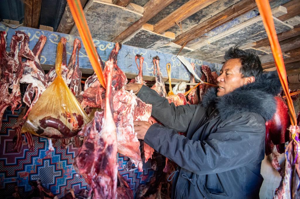 12月18日,嘎瑪熱杰在家中倉庫里檢查過冬肉食。新華社記者劉文博 攝