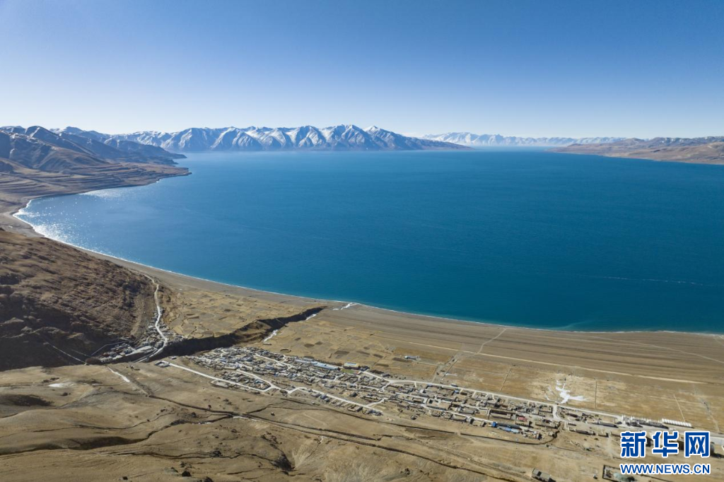 12月20日拍攝的當惹雍錯和村莊(無人機照片)。新華網(wǎng) 旦增努布 攝