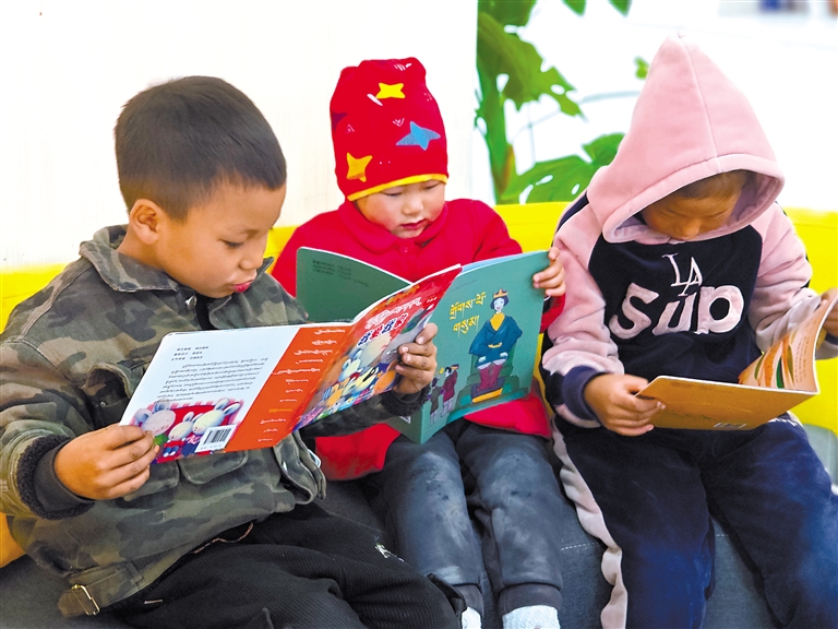 扎拉村的孩子在新時(shí)代文明實(shí)踐志愿服務(wù)隊(duì)成員的輔導(dǎo)下閱讀藏文繪本。謝筱純 王珊 攝