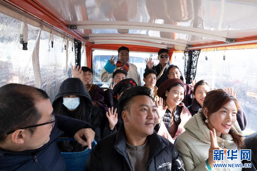 圖為墨竹工卡縣農(nóng)牧民帶表團在南京高淳國際慢城景區(qū)觀光車內(nèi)合影留念(12月24日攝)。新華網(wǎng)發(fā) 李騰 攝