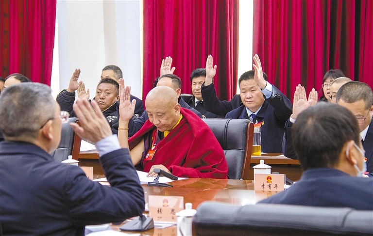 圖為日喀則市第二屆人民代表大會第四次會議主席團(tuán)第一次會議主席團(tuán)成員舉手表決。