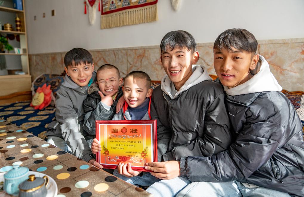 1月8日,“幸福家庭”的孩子們展示獎(jiǎng)狀。新華社照片,拉薩,2024年1月9日 新華社發(fā)(丁增尼達(dá)攝)