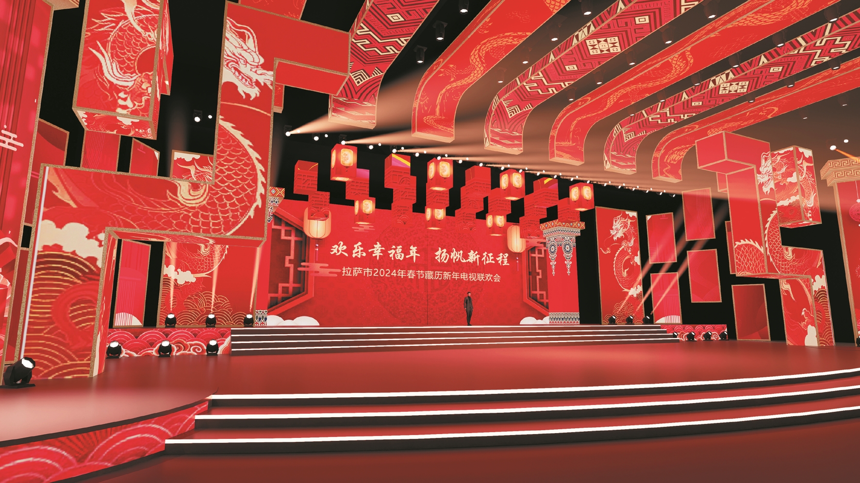 拉薩市2024年春節(jié)、藏歷木龍新年電視聯(lián)歡會(huì)舞臺(tái)效果圖。 (拉薩藏晚劇組供圖)