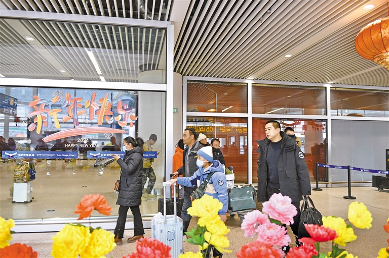 春運(yùn)首日,旅客正走出拉薩貢嘎機(jī)場(chǎng)。記者 旦增蘭澤 攝