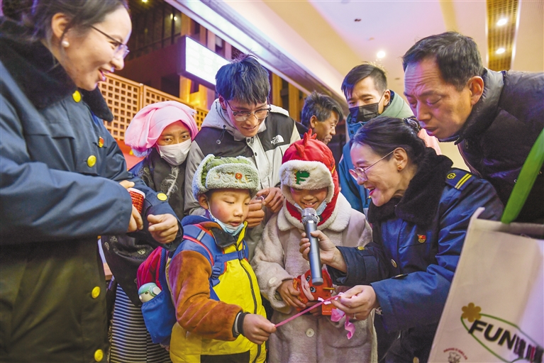 春運(yùn)首日,拉薩火車站候車大廳開展新春猜謎活動(dòng),為參與活動(dòng)的旅客送上新年伴手禮。記者 丹增群培 攝