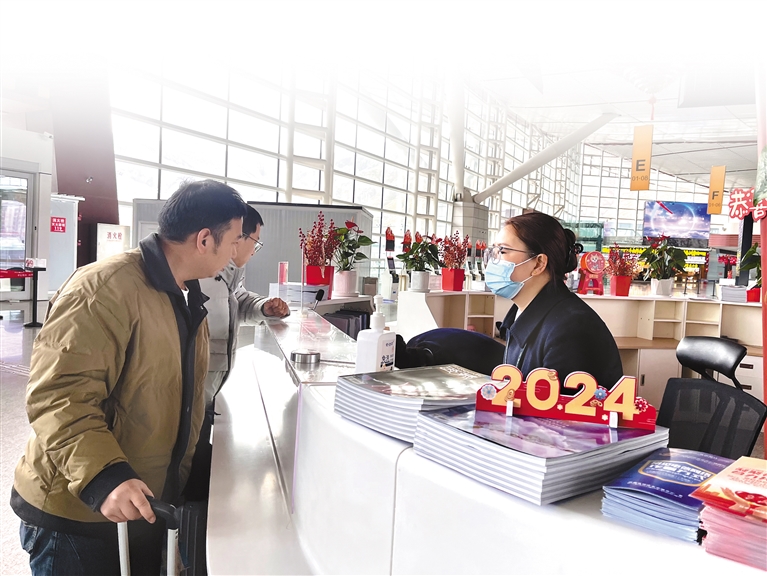 旅客正在拉薩貢嘎機(jī)場(chǎng)咨詢臺(tái)咨詢航班信息。記者 旦增蘭澤 攝