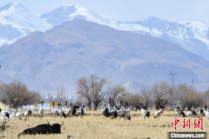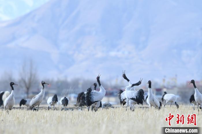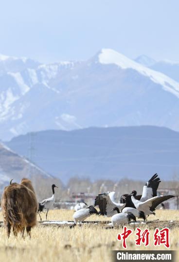圖為拉薩林周縣黑頸鶴保護區(qū)內(nèi),黑頸鶴正在覓食、嬉戲。貢嘎來松 攝