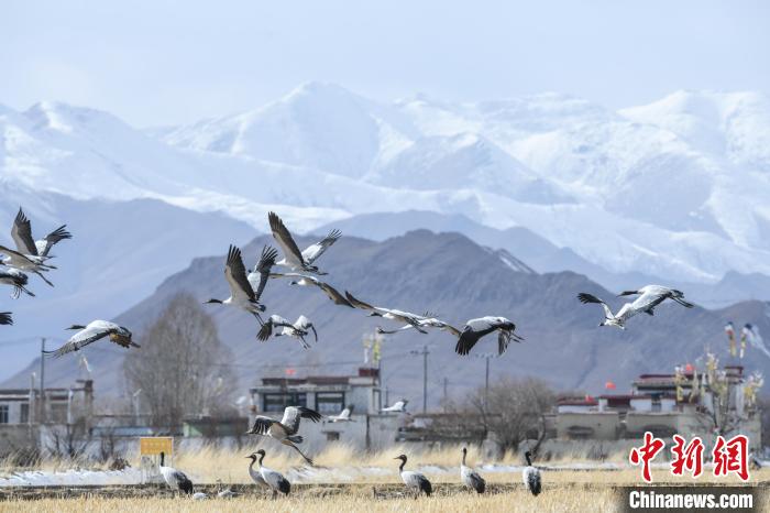 圖為拉薩林周縣黑頸鶴保護區(qū)內(nèi),黑頸鶴在雪山翱翔。貢嘎來松 攝