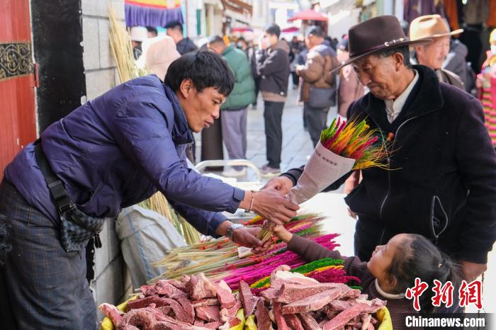 2月5日,拉薩藏歷新年年貨市場(chǎng),桑旦賣(mài)出一把羅薩美朵。中新社記者 江飛波 攝