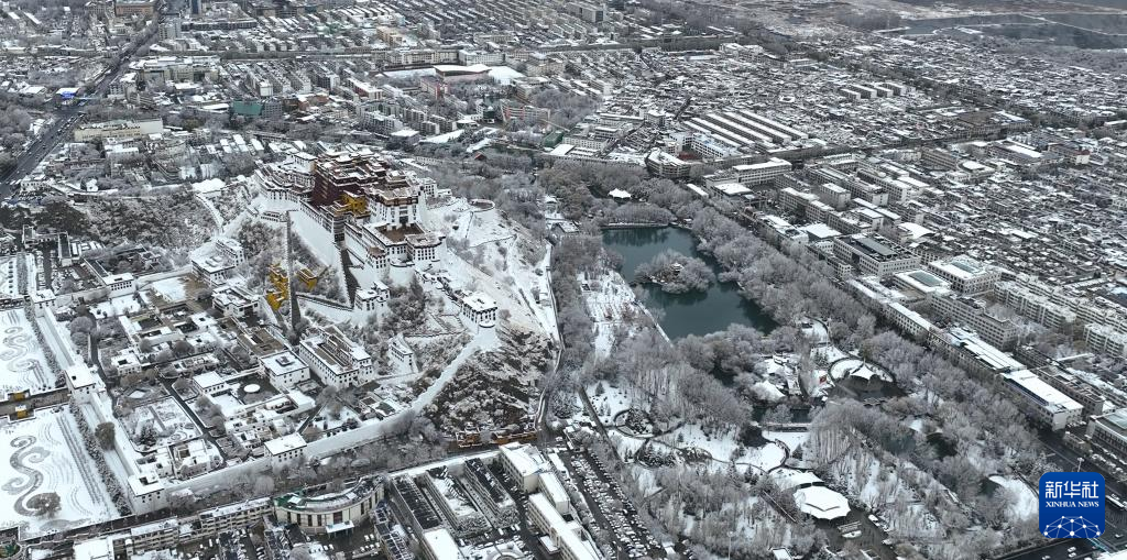 2023年12月8日,雪后的布達拉宮及其后的“宗角祿康”龍王潭公園(無人機照片)。新華社記者 洛卓嘉措 攝