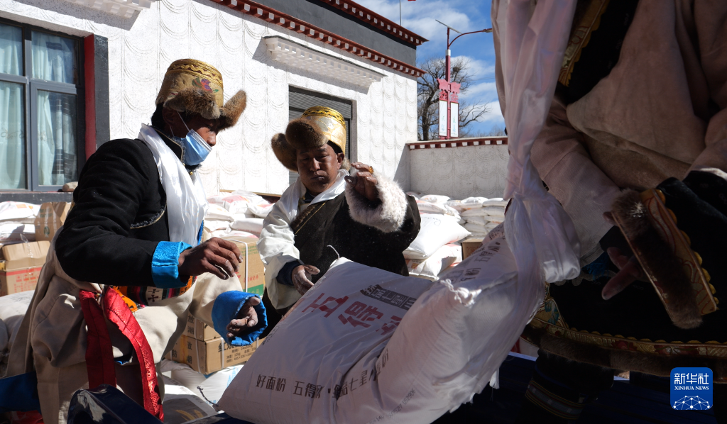 2月3日,努堆村2023年分紅大會(huì)現(xiàn)場,村民們在將分紅物資搬運(yùn)上車。新華社記者 格桑朗杰 攝