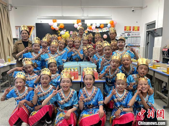 圖為襄陽市“格?;ā敝Ы虉F老師陪瓊結(jié)鎮(zhèn)小學(xué)孩子們過集體生日。曲杰 供圖