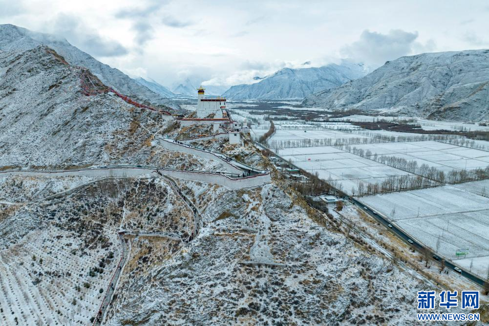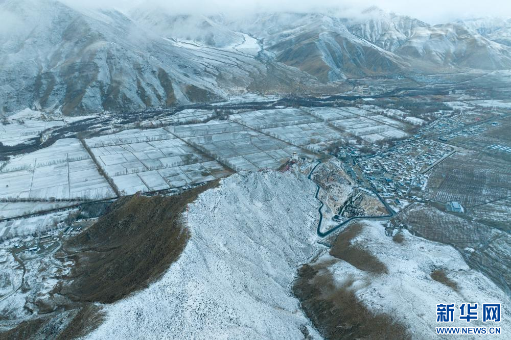 2月15日拍攝的雪后雍布拉康和山腳下的村莊(無人機照片)。新華網 旦增努布 攝
