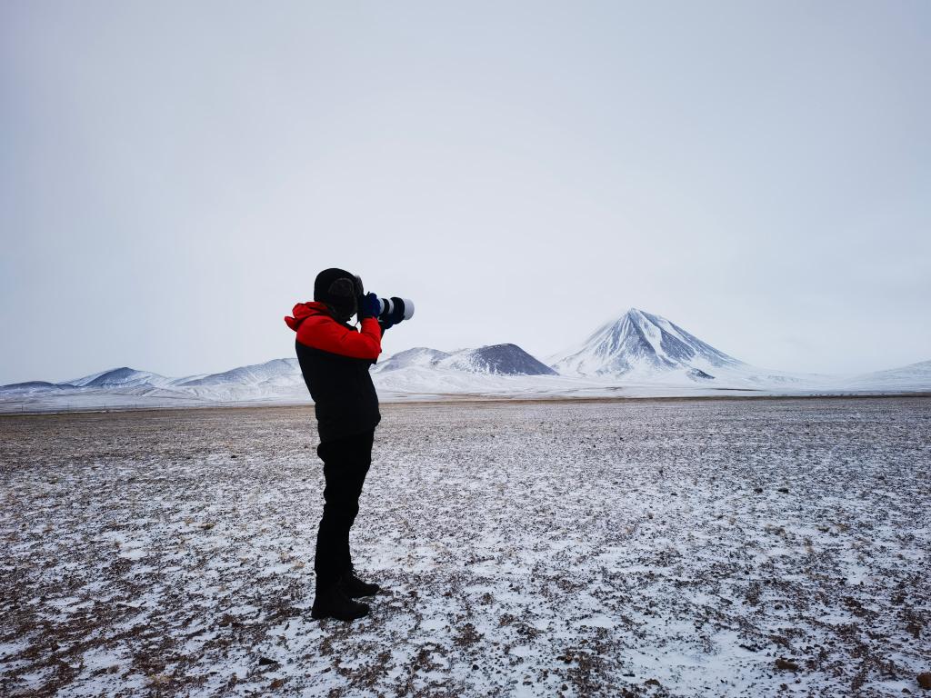 2月2日,新華社記者在雪中前行。新華社記者 普布次仁攝